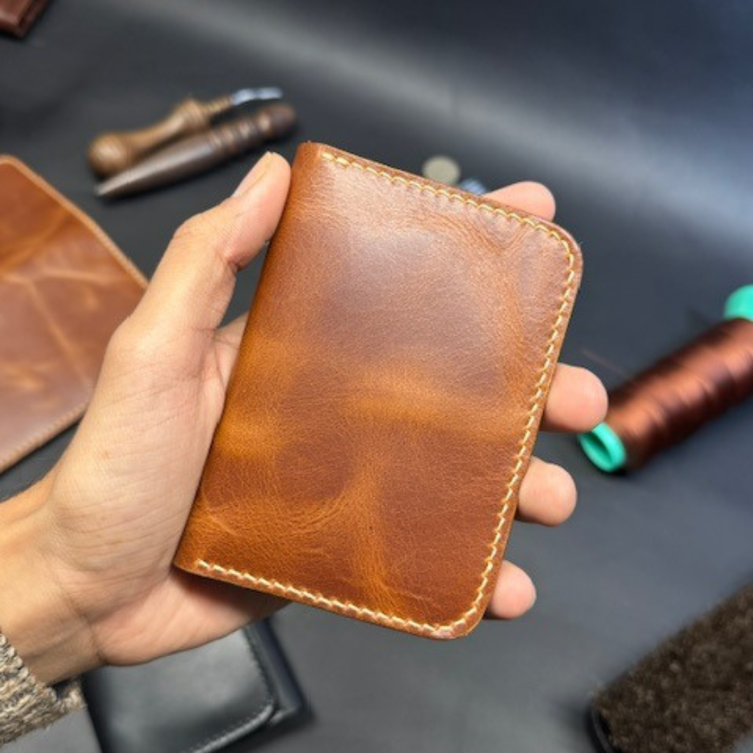 Handcrafted slim bifold card holder made from rich vintage mid brown color leather with contrast stitching. Compact and lightweight, it’s designed to carry essential cards and cash while developing a unique patina over time for a refined, timeless look.